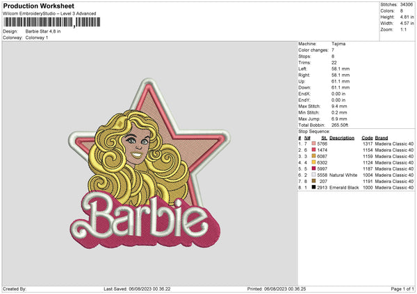 Barbie Star Embroidery File 6 sizes