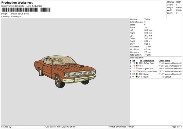 Classic Car V6 Embroidery File 6 sizes
