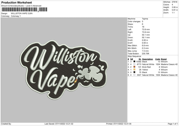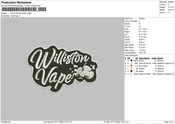 Williston Vape Embroidery File 6 sizes